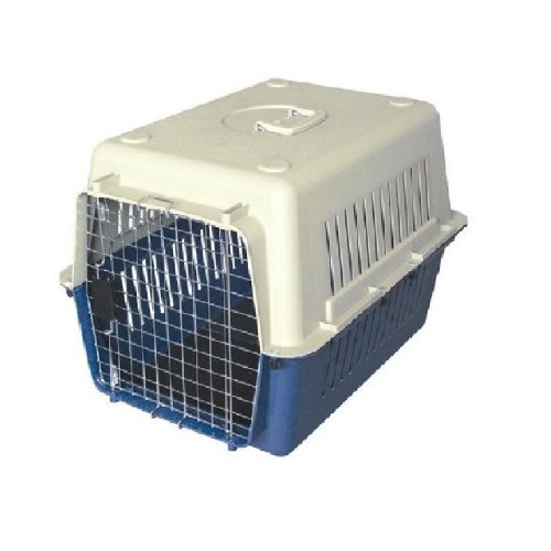 Transportadora de plástico resistente, segura, con puerta metálica, bicolor (gris/azul), cuenta con agarradera para fácil manejo y ensamblado sin complicaciones con tornillos, sus dimensiones son de 68 x 51 x 47 cm. Con piso sanitario de plastico